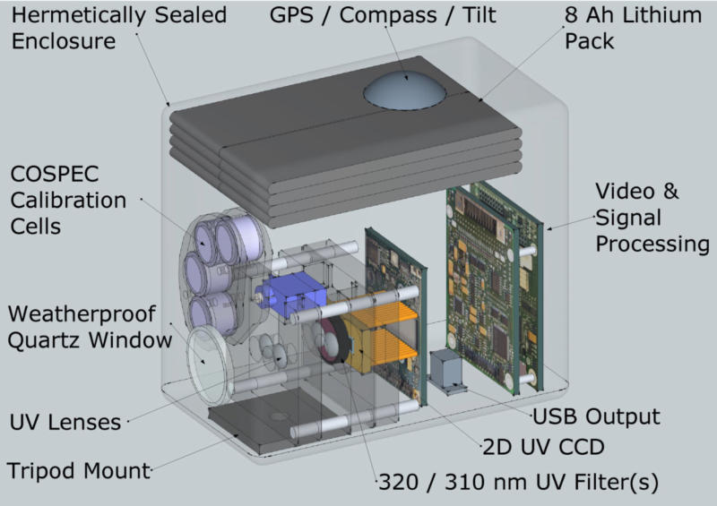 气体摄像机拍摄到大气中二氧化硫的羽状物,产生的彩色图像显示了浓度。微型化的强磁场仪器是环境和地球科学应用的理想选择。 目前还没有其他商业上的完整软件包可以远程检测和测量二氧化硫的浓度,并实时地对其进行绘图。 这款相机配有标准的GPS和罗盘,带有倾斜传感器,可以通过USB连接到笔记本电脑上。可以提供可选的无线实时输出。LabVIEW接口也很容易修改,以适应特殊的应用。
