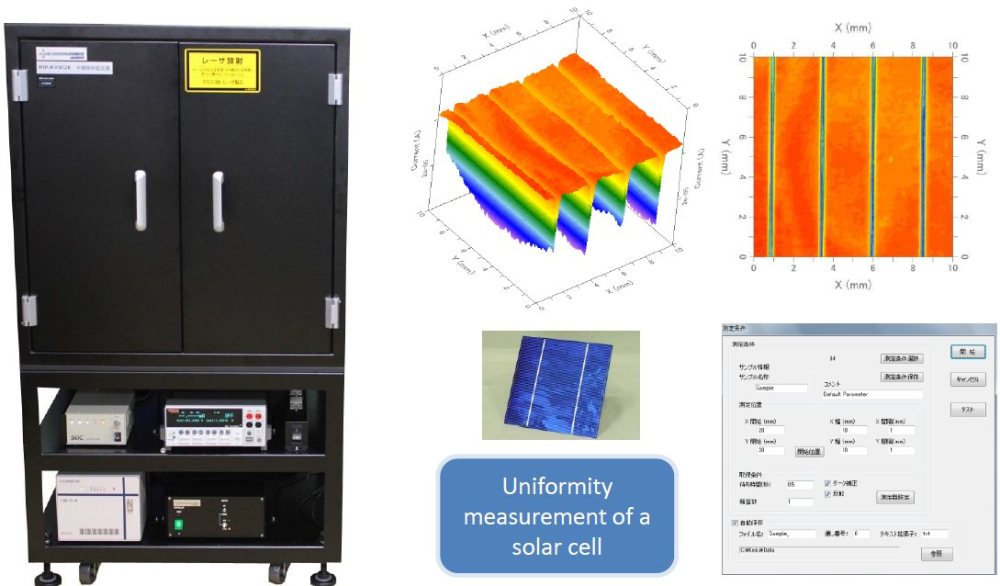 The Model LBC-1 Laser Induced Current Measurement System can perform mapping measurement of the photocurrent of the photoelectric converting element for the solar cells and etc. by irradiating the laser beam on the solar cell and moving it with the X-Y stage.